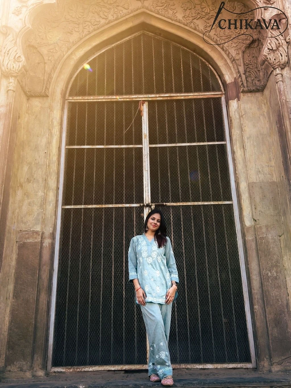 Chikavaa Handcrafted Mint Green Chikan Embroidered Kurti and Palazzo Set
